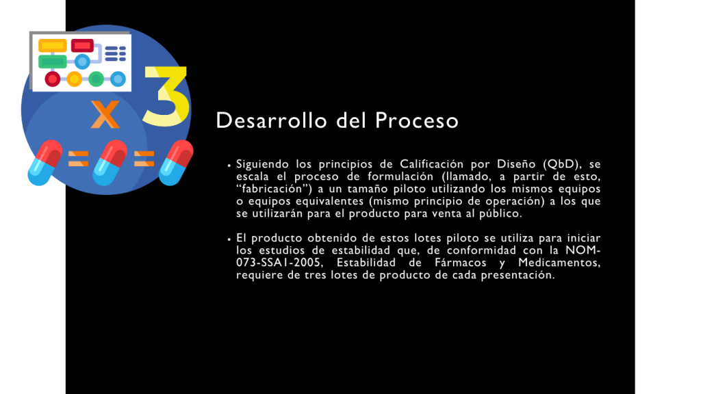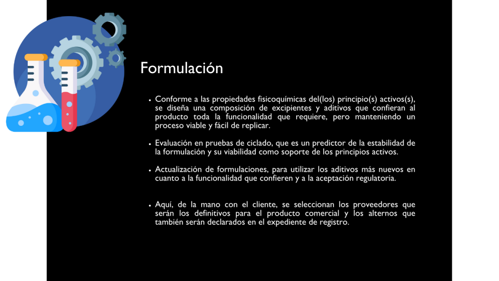 Partiendo de idear un producto o extensión de línea de un producto con una diferenciación que aporte una ventaja competitiva en el mercado, analizamos la factibilidad antes de iniciar con el desarrollo y conformación del expediente que habrá que someter a la COFEPRIS para que, una vez que se ha emitido el registro sanitario podamos fabricar los lotes comerciales, o bien, llevar a cabo la transferencia de tecnología para que el cliente fabrique donde más le convenga.