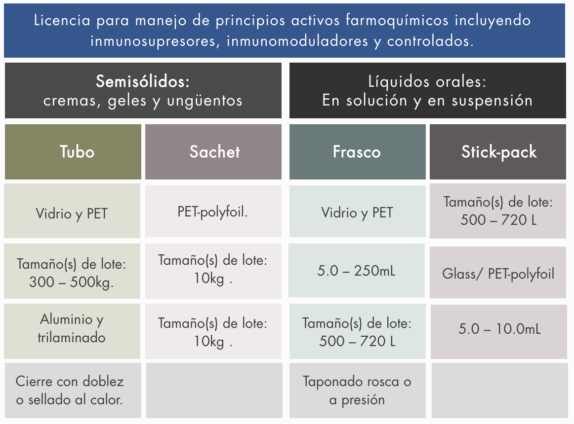 Contamos con las siguientes líneas de fabricación dentro de nuestra planta ubicada en San Pedro de los Pinos, Ciudad de México, con certificación de Buenas Prácticas de Fabricación (cGMP).